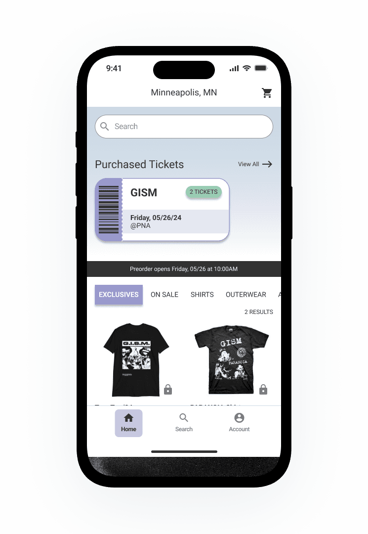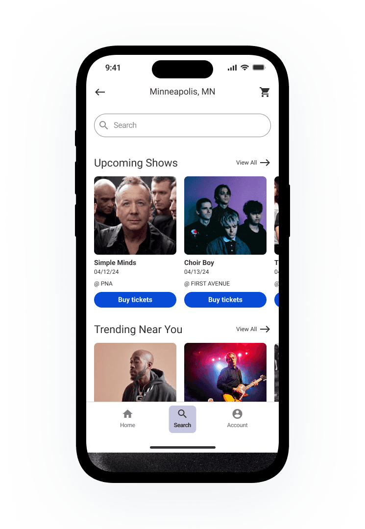 If tickets to a concert have already been purchased, the homepage will populate with events in sequential order by date (Fig. 3). If not, the homepage will be empty, and the user can search for upcoming shows they are interested in (Fig. 1 & 2).
