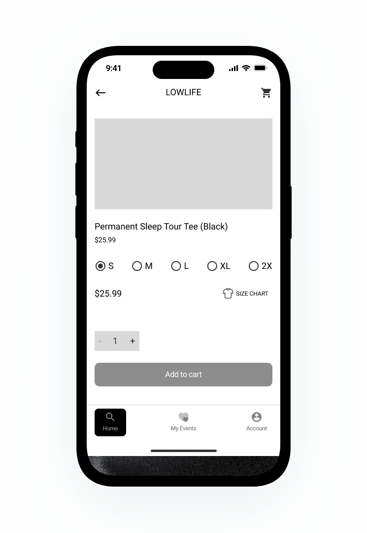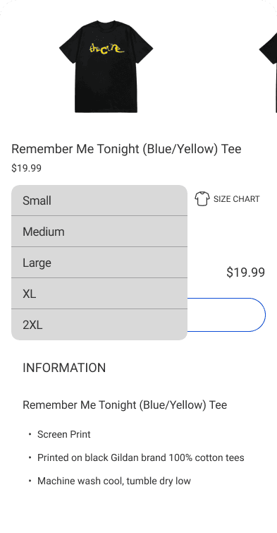 The user finds the merch they like, then with the information one would expect from a clothing site available (size guide, material, price, etc.), they can make an informed decision - no more too tight or loose fitting shirts, and no more waiting in long merch lines!